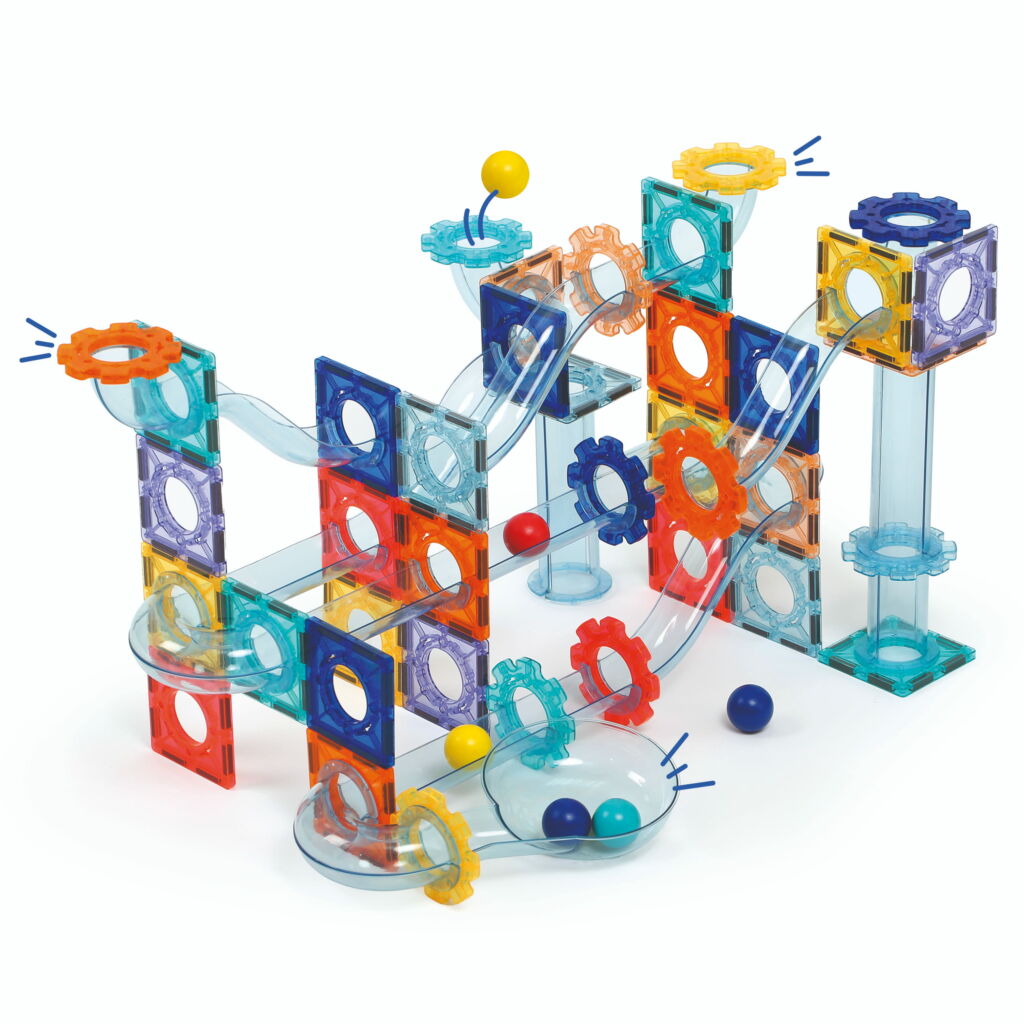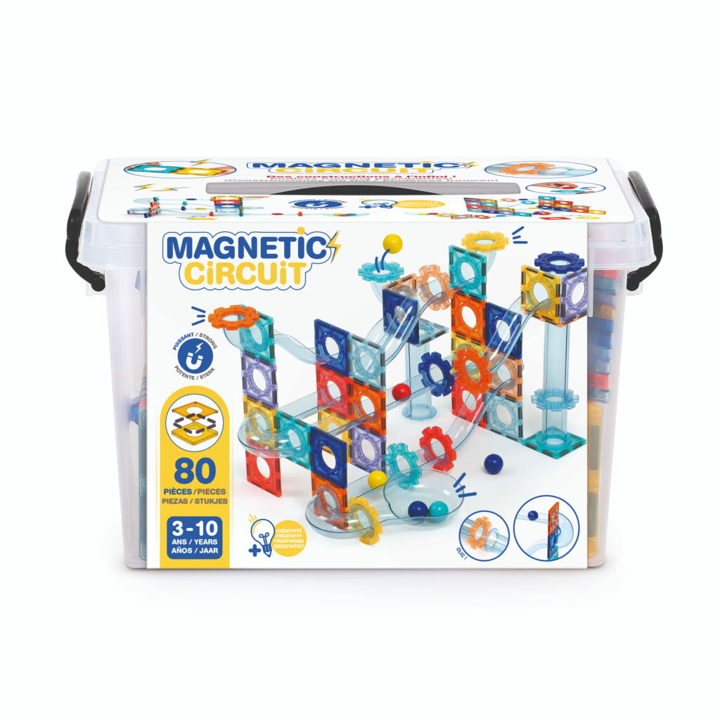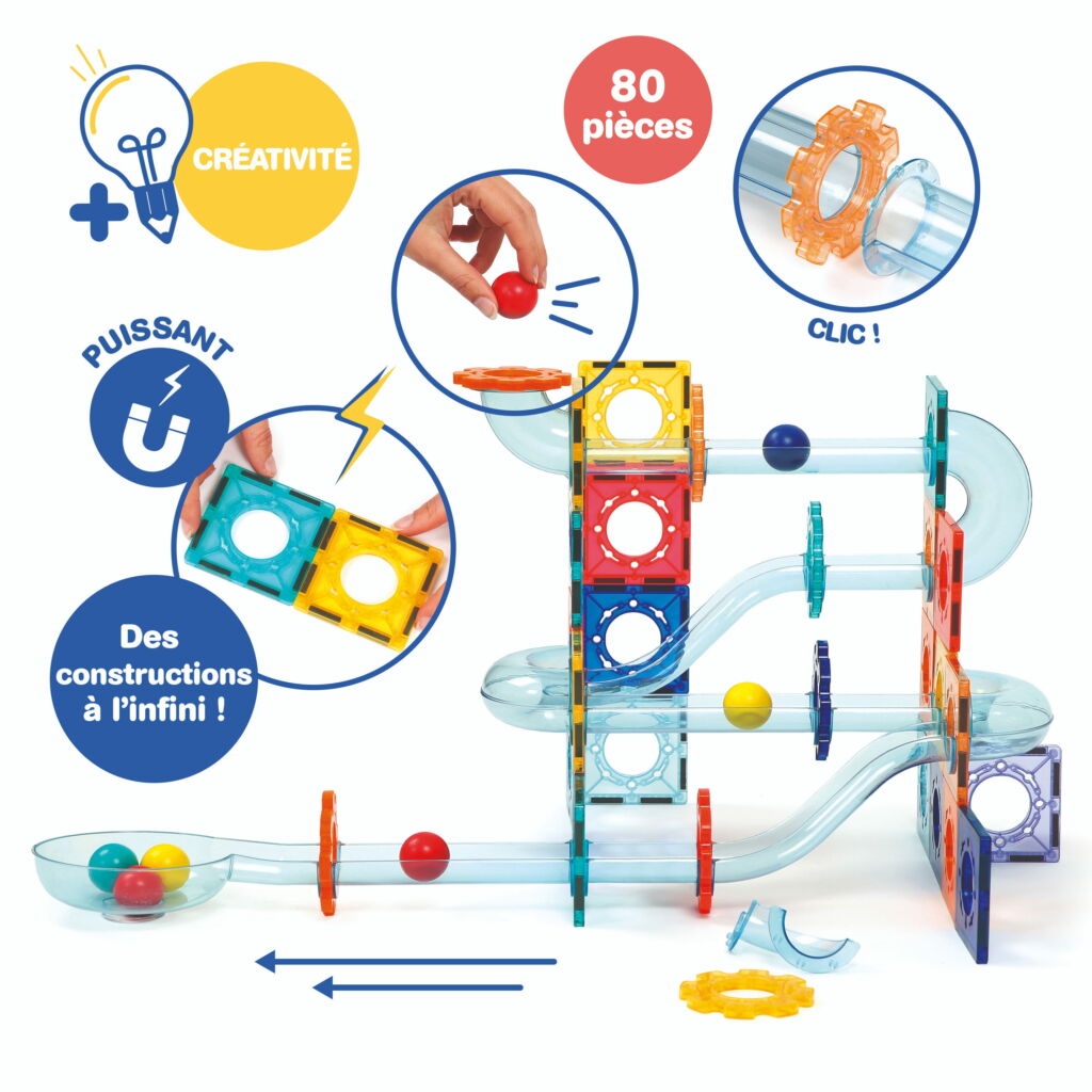 Circuit à billes magnétique avec plaques aimantéespièces de parcours et billes pour créer des constructions en 2D et 3D. Stimule la logique, la motricité fine et l’éveil scientifique dès 3 ans.