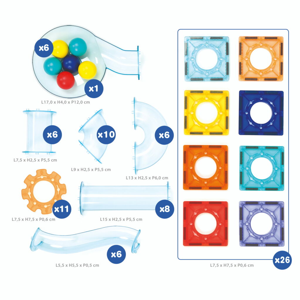 Contenu : 26 plaques aimantées, 48 pièces de parcours, 6 billes