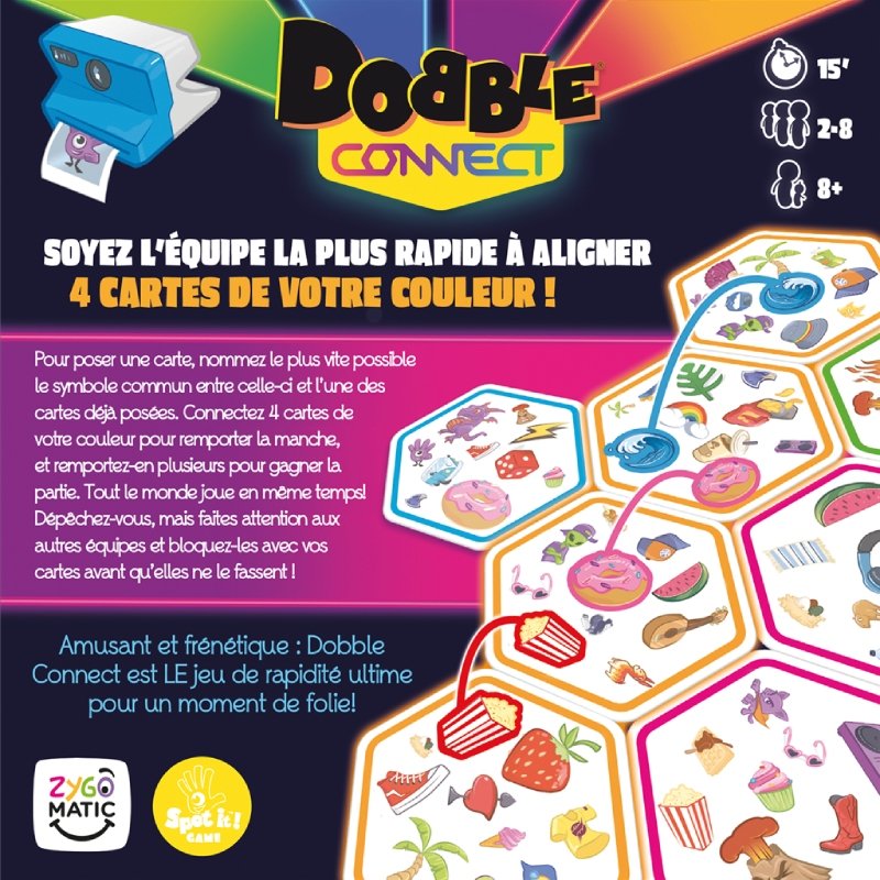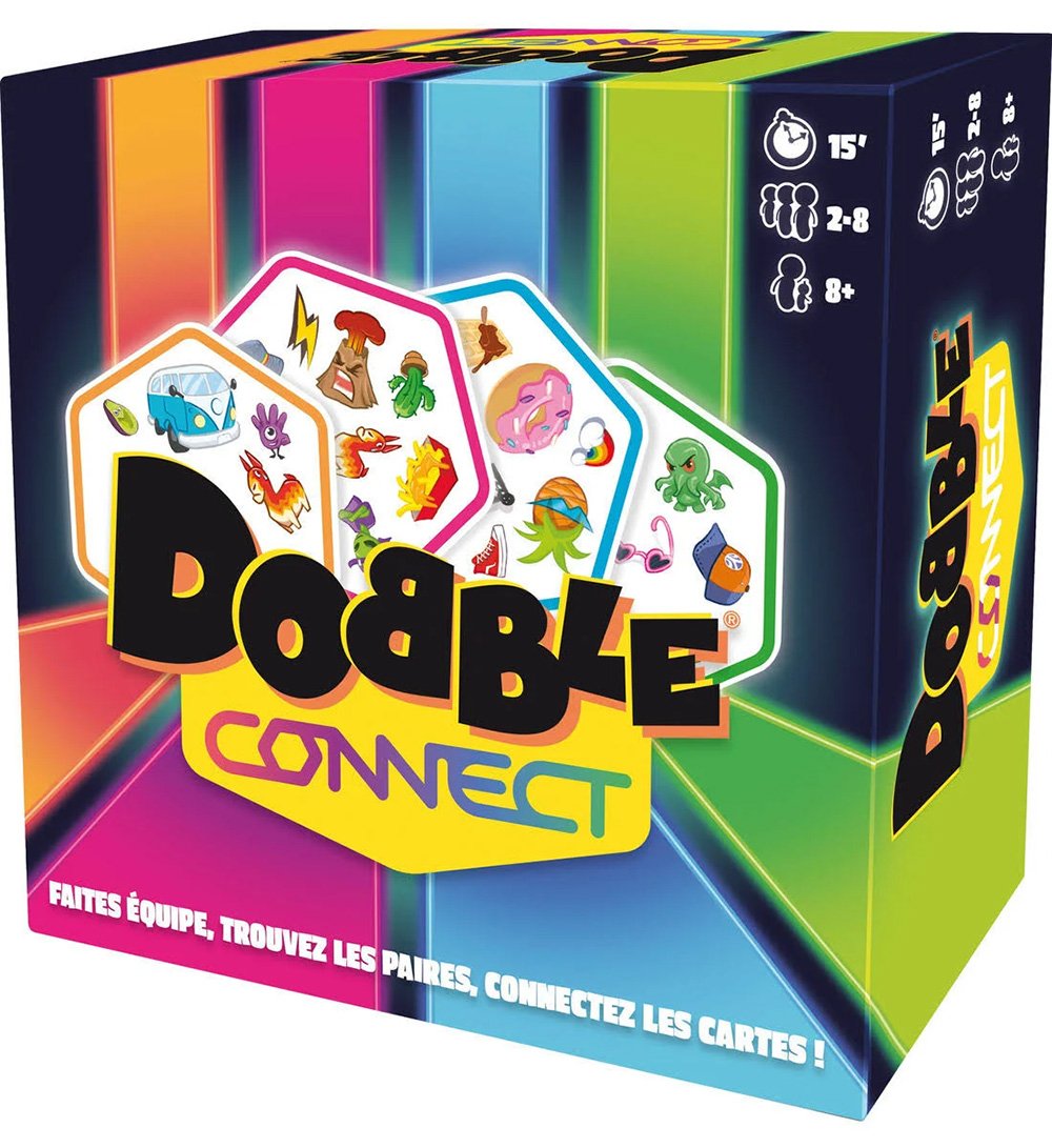 Trouvez la paire et alignez les hexagones ! Jouez à Dobble en équipes ! Retrouvez le seul symbole commun et aligner 4 cartes De nouvelles règles amusantes pour s’amuser en famille ou entre amis ! Repérez le symbole commun entre vos cartes, alignez-en 4 pour gagner, et empêchez vos adversaires d’y parvenir avant vous ! Dobble Connect se joue par équipe de deux. Soyez rapides pour être les premiers à créer une ligne droite de 4 hexagones à votre couleur et remporter la manche.