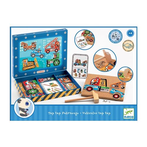 Véhicules Tap tap. Comme papa, dans son atelier de bricolage, l’enfant fait résonner son marteau pour construire sa voiture. Pour cela, il doit assembler toutes les pièces sur la plaque de liège et les fixer avec précision avec des petits clous. A partir de 4 ans.