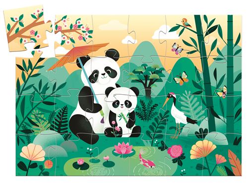 Léo le panda et sa maman se reposent à l’ombre des bambous. Un magnifique puzzle de 24 pièces dans une boîte en forme de panda. Boîte silhouette décorative pour la chambre de l’enfant.
