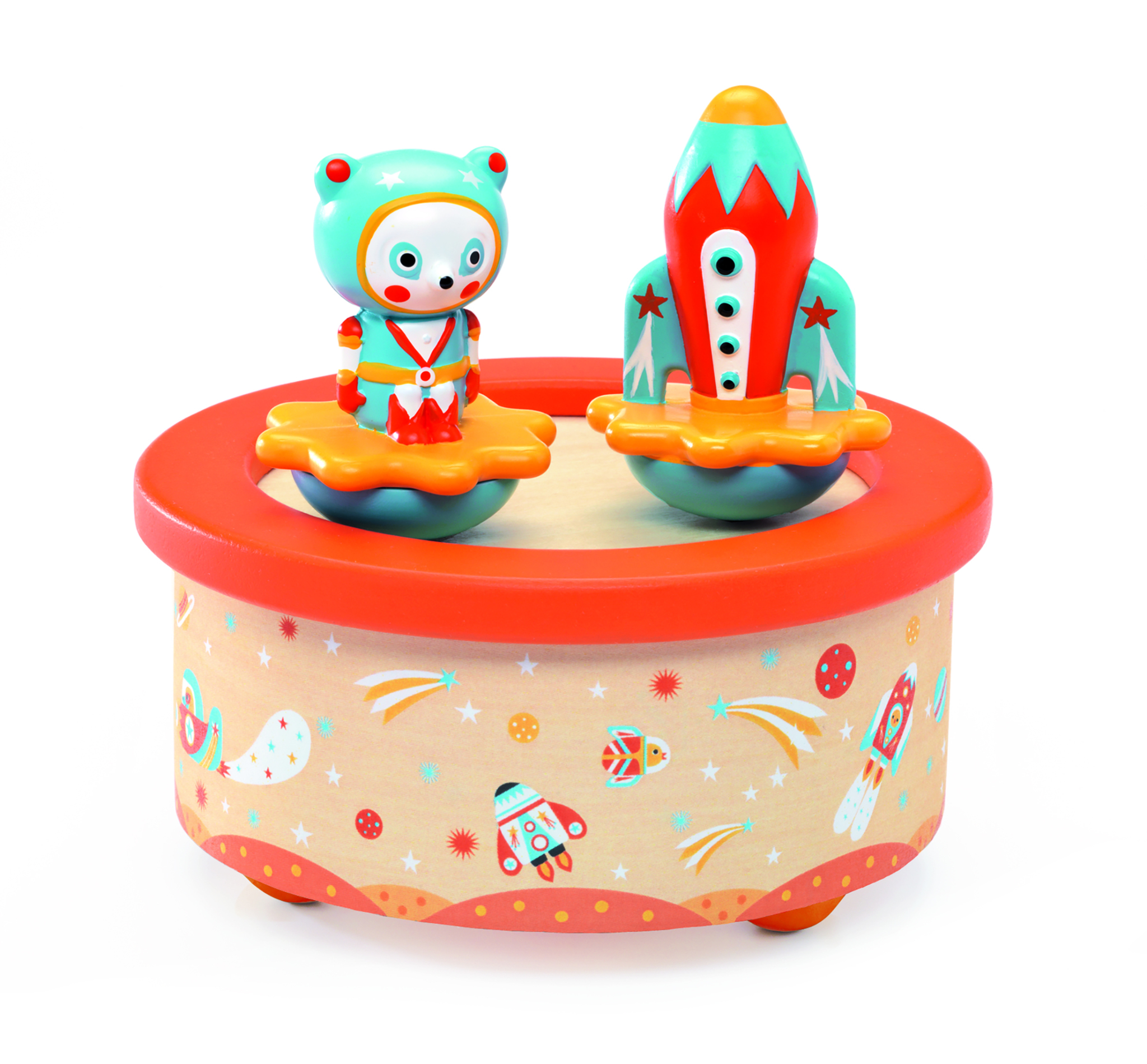 Découvrez la boite à musique de Djeco, une jolie boite à musique ronde en bois avec deux personnages rigolos pour éveiller ou endormir les bébés.