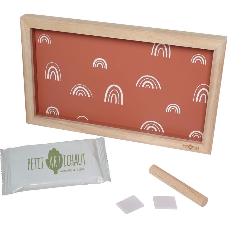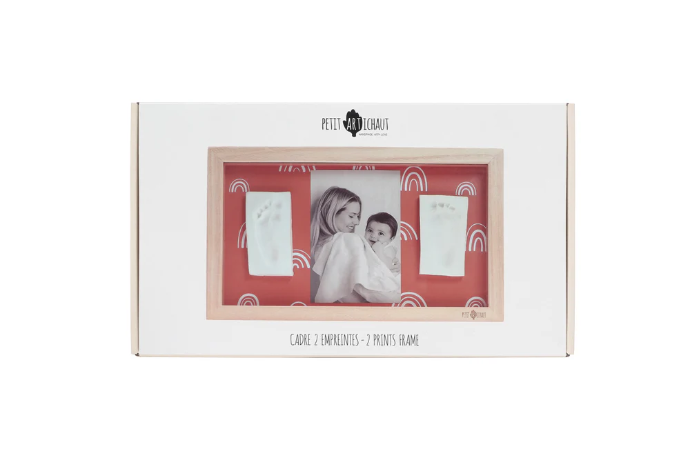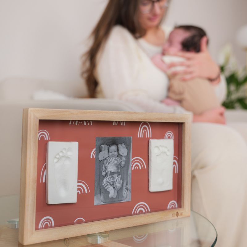 Rainbow Terracotta offre un espace généreux pour  empreintes et photo. Ce cadre long s’accroche au mur et inclut fond recto verso de couleur terracotta avec ou sans motifs arc-en-ciel. Le kit comprend de la pâte hypoallergénique, un rouleau et un descriptif pour créer facilement les empreintes.